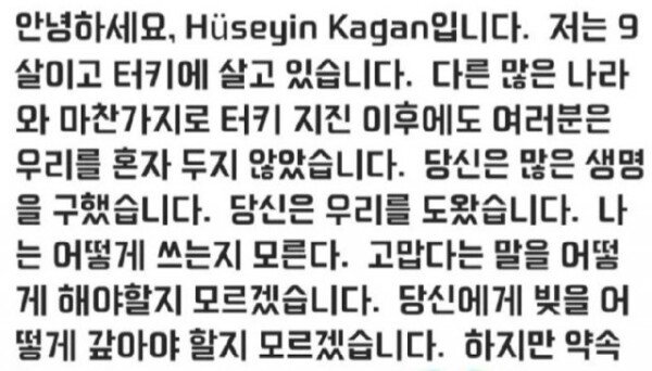 Hussain, who introduced himself as a 9-year-old boy living in Denizli, Turkey, said, “After the earthquake, Korea along with other countries saved our lives. I don’t know,” he said. “I also want to be a person who does good things in the world when I grow up. I will visit Korea,” he added, adding, “If I go on vacation to Korea later, I will treat you as a guest at my house.” Hussein sent this message translated not only into Turkish but also into English and Korean.
