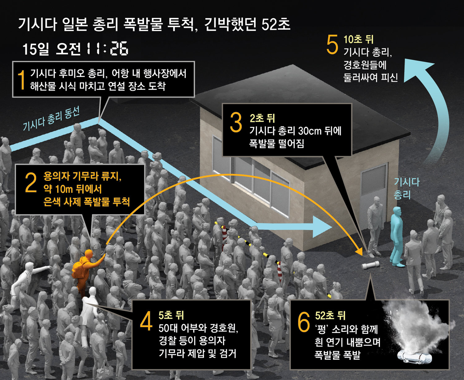 Prime Minister Kishida looked back when the scene was disturbed with the sound of something falling behind him, and immediately after the bodyguard pushed the object away, he unfolded a bulletproof cover and wrapped it around the prime minister. The suspect, a man in his 20s who threw the object, was immediately subdued by nearby citizens and then arrested by the police. The explosives hit the ground and 52 seconds later there was a “pop” sound, but Prime Minister Kishida fled the scene before that.