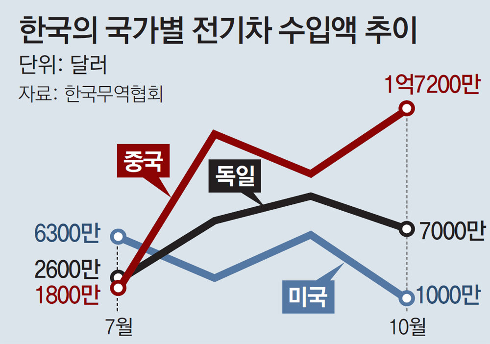 According to the Korea International Trade Association on the 26th, Korea’s electric vehicle imports from January to October this year totaled $1.945 billion (about 2.54 trillion won), a 23.3% increase over the same period last year. By country, the order is Germany (USD 788 million), China (USD 538 million), and the United States (USD 459 million).