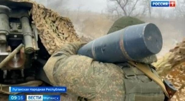 The photo is a report from Russia’s state-run broadcaster ‘Rosia 1’ and shows pro-Russian separatist rebels and Russian soldiers occupying the Luhansk region in eastern Ukraine transporting 152mm blue artillery shells of unknown origin.