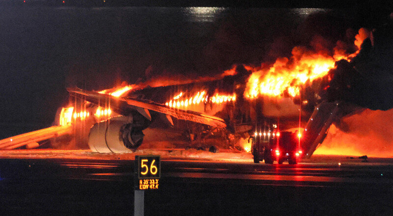 On the 2nd (local time), Japan Airlines (JAL) Flight 561 was engulfed in flames as it landed on the runway at Haneda Airport in Tokyo, Japan. 2024.01.02. [도쿄=AP/뉴시스]NHK reported the situation at the scene, saying, “The plane fire started in the engine side of the aircraft and spread to the entire fuselage,” and “Black smoke billowed out along with flames from the windows.” The Airport Fire Department mobilized about 70 fire trucks to extinguish the fire, but the flames continued beyond 7:30 p.m. and the aircraft was completely destroyed.