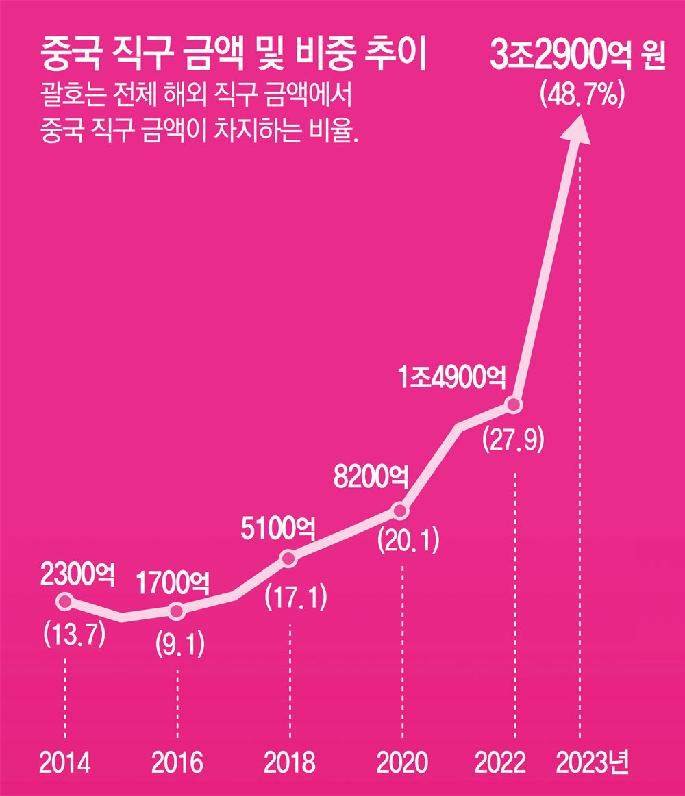 On the other hand, America’s popularity is gradually fading. The amount of direct purchases in the United States decreased by 7.3% from a year ago to 1.86 trillion won, giving up the top spot to China for the first time. The proportion, which was over 70% just 9 years ago, has shrunk to 27.5%. The amount of direct purchases in Europe, which ranked third after China and the United States, plunged 22.9% to KRW 880 billion.